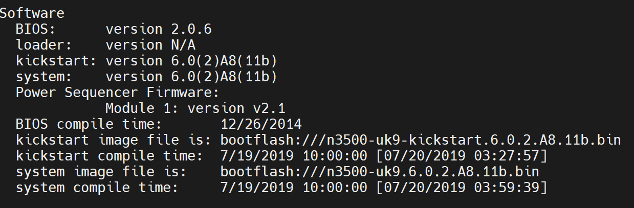 對於舊版本,kickstart 和 system 映像必須保持一致。例如 kickstart 使用 n3500-uk9-kickstart.6.0.2.A8.11b.bin,則 system 映像應為 n3500-uk9.6.0.2.A8.11b.bin 。